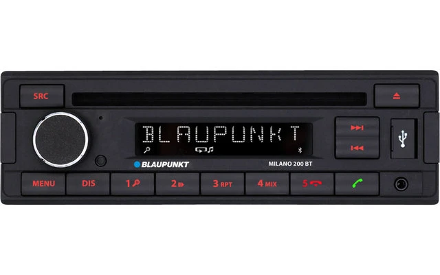 12 Volt Radio (1-DIN) mit FM/AM/RDS-Tuner (AF, PS, TA, TP & CT), LC-Display mit Uhrzeitanzeige, Bluetooth-Freisprechfunktion, Telefonbuch-Upload und Audio Streaming, Integriertes Mikrofon, Media Player, Audio Wiedergabe von USB