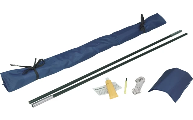 Zelt-Reparaturset bestehend aus: Fiberglasgestänge, Gummikordel, Zeltstoff und Gewebekleber.