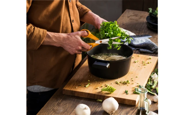 Die individuell durch eine Schraube einstellbare Klingenspannung erleichtert das Schneiden, der Fiskars – typische orangefarbene Griff sorgt dabei für sicheren Halt und gute Kraftübertragung. Dank des ergonomisch geformten, asymmetrischen Griffs liegt die Schere auch bei langer Nutzung und schwierigen Schneidarbeiten gut in der Hand.