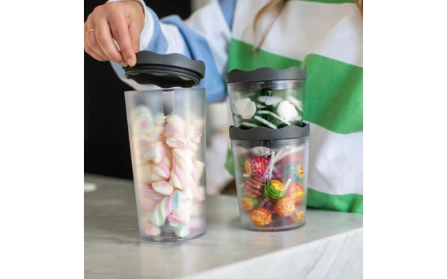 Von klein bis groß, von Mehl, Müsli, Zucker, Tee und Kaffee bis zum passenden Keks, PRINCE hat für alles Platz, was luftdicht aufbewahrt werden soll. Der Deckel mit Lamellen schließt so gut ab, dass sogar Flüssigkeiten problemlos darin gelagert werden können und macht PRINCE zum idealen Begleiter für den Einkauf von unverpackten Lebensmitteln. Die Dosen kommen in klarem Material mit Sichtfenster. So sieht man gleich, was drinnen ist und muss nicht lange suchen. Die farbigen Deckel helfen zusätzlich bei der Unterscheidung. Das Set besteht aus drei verschiedenen Größen, alle Dosen sind stapelbar und miteinander kombinierbar.