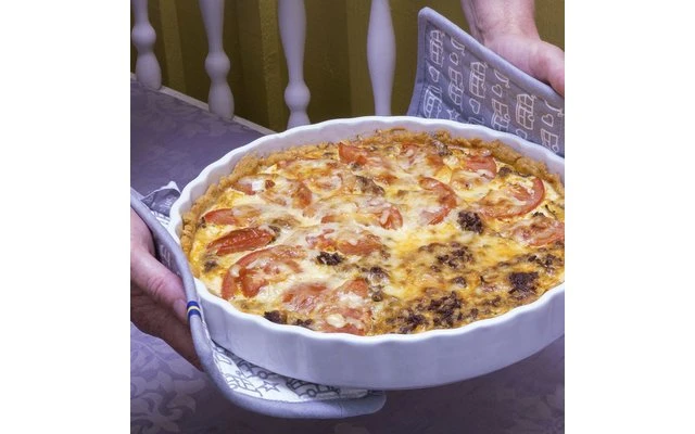Pufz Topflappen mit zwei verschiedenen Mustern (Wohnwagen/Wohnmobil), einmal weiß auf grau und einmal grau auf weiß.