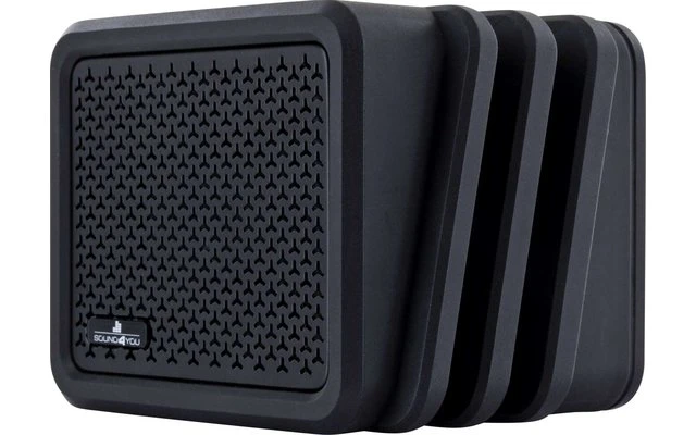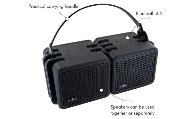 - Zwei Lautsprecher können zusammen oder einzeln genutzt werden (mit praktischen Trageband)