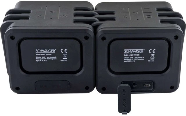 2x Bluetooth Lautsprecher, Y 3,5 mm Klinkenkabel, USB Y Micro USB Ladekabel, Trageband, Bedienungsanleitung
