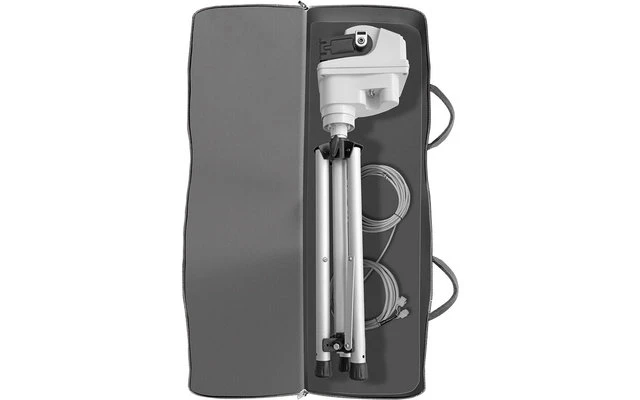 Leicht in 2 robusten Transporttaschen zu verstauen und zu tragen: eine für die Parabolschüssel und eine für die Außeneinheit mit Stativ und Kabel.