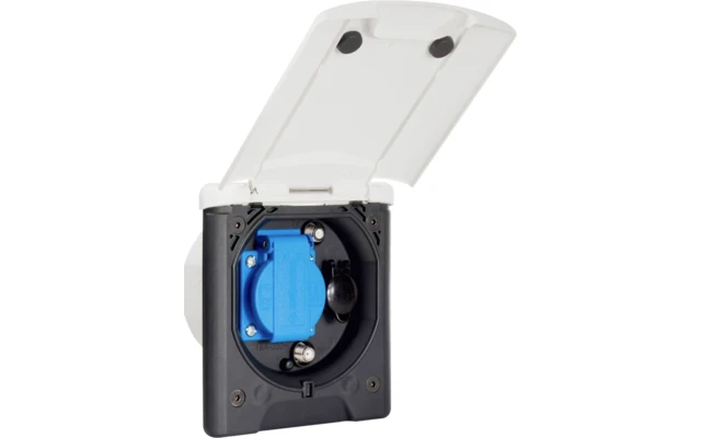 Kunststoffgehäuse mit federunterstütztem Klappdeckel und Magnetverschluss, spritzwassergeschützt IP 44. Rückseitige Kabeleinführung mit Zugentlastung. Koaxial-Kabelanschlüsse für F-Steckern (separat bestellen) für Ø 5 und 7 mm.